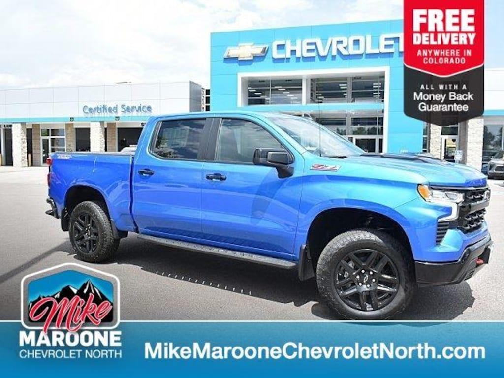 This New 2025 Chevrolet Silverado 1500 LT Trail Boss, is Riptide Blue Metallic in color with an Jet Black interior. Stock Number N325112. You can connect with us by calling (719) 249-2703. Not available with special financing, lease and some other offers. See dealer for details. ($4250), Not available with special financing, lease and some other offers. See dealer for details. ($3250), Not available with special financing, lease and some other offers. See dealer for details. ($1000) Important Package and Feature Information Convenience Package II ($1,065 value)Power Sliding Rear Window with Rear DefoggerHitch Guidance with Hitch ViewIn-Vehicle Trailering System AppUniversal Home RemotePremium Bose 7-Speaker Sound SystemAssist Step and Truck Bed Cover Value Package III ($2,445 value)Hard Folding Truck Bed CoverOff-Road High Clearance StepsPreferred Equipment Group 2LTSiriusXM with 360L Trial SubscriptionRear 60/40 Folding Bench Seat (folds Up)All-Weather Floor LinerPower Front Windows with Passenger Express DownPower Rear Windows with Express DownDeep-Tinted GlassPower Front Windows with Driver Express Up/downColor-Keyed Carpeting Floor CoveringBluetooth For PhoneInside Rearview Mirror with TiltHeated Power-Adjustable Outside MirrorsHigh Gloss Black Mirror CapsAuto-Locking Rear DifferentialIntegrated Trailer Brake ControllerElectronic Cruise Control2-Speed Electronic Autotrac Transfer CaseConvenience PackageChevy Safety Assist275/60R20SL AT BW TiresStandard TailgateEZ Lift Power Lock and Release Tailgate20" X 9" High Gloss Black Painted Aluminum WheelsCloth Seat TrimFront LED Fog LampsTeen Driver12.3" Multicolor Reconfigurable Digital DisplayOnStar Services CapablePerformance Red Recovery HooksTire Pressure Monitoring SystemSteering Wheel Audio Controls6-Speaker Audio SystemHD Rear Vision CameraSuspension PackageTrailering PackageProtection Package ($685 value)Rear Wheelhouse LinersChevytec Spray-On Black Bedliner Safety and Security Forward collision mitigation - Forward thinking. You look away for just a second and suddenly the vehicle in front of you has stopped. That's when the forward collision mitigation system comes to life. When it senses an impending impact, it will activate a combination of features to help prevent or reduce the severity of an accident. Forward collision mitigation is always looking ahead. Pedestrian impact prevention - An extra step toward safety. Pedestrians don't always stop, look, and listen, but with Pedestrian Impact Prevention, your vehicle is equipped to better see them and avoid them. This system constantly monitors the road ahead to identify and track pedestrians. It projects that image to an interior display screen, AND should an impact become likely, Pedestrian impact prevention takes steps to avoid a collision. Rear camera - Watching your back! The rear camera helps you see obstacles and hazards you otherwise couldn't by showing enhanced images of what is behind you. The rear camera is an extra set of eyes that's both convenient and safe.Technology and Telematics Apple CarPlay/Android Auto smart device wireless mirroring Mobile hotspot - WiFi on the fly. Connect your devices to the Internet through your vehicles private mobile hotspot and take the internet wherever your journey takes you, without eating up your data allowance. Find the hotspot with mobile hotspot. FINANCING OPTIONS: Take advantage of our attractive low-rate financing options. Our access to various Credit Unions and National Banks can provide financing for most credit levels. We can tailor a finance package to fit your needs. To get started, complete our secure online credit application. FREE DELIVERY ANYWHERE IN COLORADO. Our dealerships sell more Chevrolets than any single dealership in the state. We have the largest Chevy inventory of Trax and highest customer satisfaction. At Mike Maroone, if you dont like it ... Bring it back! For more information or vehicles like it, stop by Mike Maroone North today. We are just nort