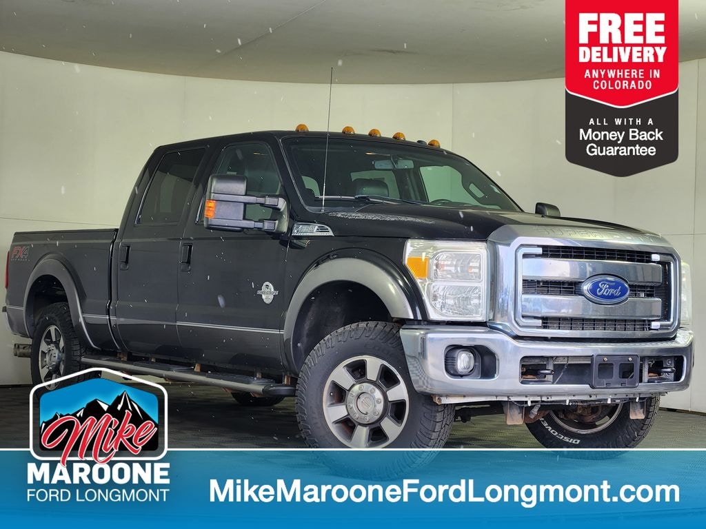 Recent Arrival! Clean CARFAX. FREE DELIVERY ANYWHERE IN COLORADO, 2013 Ford F-250 Super Duty Lariat 4x4 Crew Cab, 6.7L Power Stroke V8 Turbo Diesel Engine, 6-Speed Automatic Transmission, Four-Wheel Drive, Tuxedo Black Metallic Exterior, Black Leather Interior, Lariat Ultimate Package, Navigation System, Power Moonroof, Heated and Cooled Front Seats, Remote Start System, Memory Driver Seat, Leather 40/Console/40 Front Seats, Sony Premium Audio System, SYNC with MyFord, Dual-Zone Automatic Climate Control, Power Adjustable Pedals, Power Sliding Rear Window, PowerScope Power-Telescoping Trailer Tow Mirrors, Trailer Tow Package, Trailer Brake Controller, Trailer Sway Control, Electronic Locking Rear Axle 3.31 Ratio, LT275/70R18E All-Terrain Tires, 18-Inch Wheels, FX4 Off-Road Package, Skid Plates, Hill Start Assist, Reverse Sensing System, Rear View Camera, Power Running Boards, Tailgate Step, Tough Bed Spray-In Bedliner, Engine Block Heater, Snow Plow Prep Package, Upfitter Switches, 5th Wheel/Gooseneck Hitch Prep Package. Black 2013 Ford F-250SD Lariat 4D Crew Cab Power Stroke 6.7L V8 DI 32V OHV Turbodiesel TorqShift 6-Speed Automatic with Overdrive 4WD