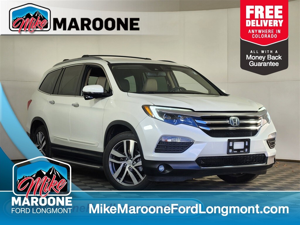 FREE DELIVERY ANYWHERE IN COLORADO, BLUE CERTIFIED, ALL WHEEL DRIVE, NAVIGATION, BLUETOOTH/HANDS FREE, REAR BACKUP CAMERA, White Diamond Pearl, Ultra Low Emission Vehicle (ULEV-2), 3.5L V6 24-Valve SOHC i-VTEC Engine, 9-Speed Automatic Transmission, 4.334 Axle Ratio, 5,842 lbs GVWR, P245/50R20 102H AS Tires, 20" Alloy Wheels, Heated Front Bucket Seats, Leather-Trimmed Seats, AM/FM Premium Audio System, Honda Satellite-Linked Navigation System, SiriusXM Radio, Beige Interior.. Priced below KBB Fair Purchase Price! Odometer is 19005 miles below market average! White Diamond Pearl 2016 Honda Pilot Touring 4D Sport Utility 3.5L V6 24V SOHC i-VTEC 9-Speed Automatic AWD